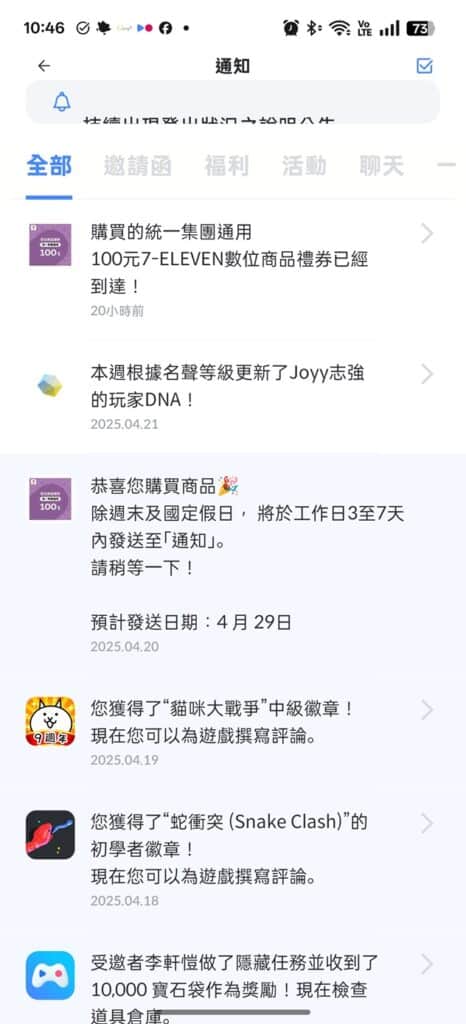 | 2025/04/11 | 7-11 禮券 NT$100 | 2,500 金幣 | 兌換紀錄 |