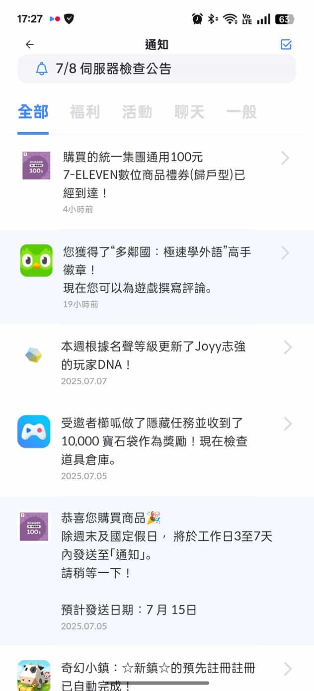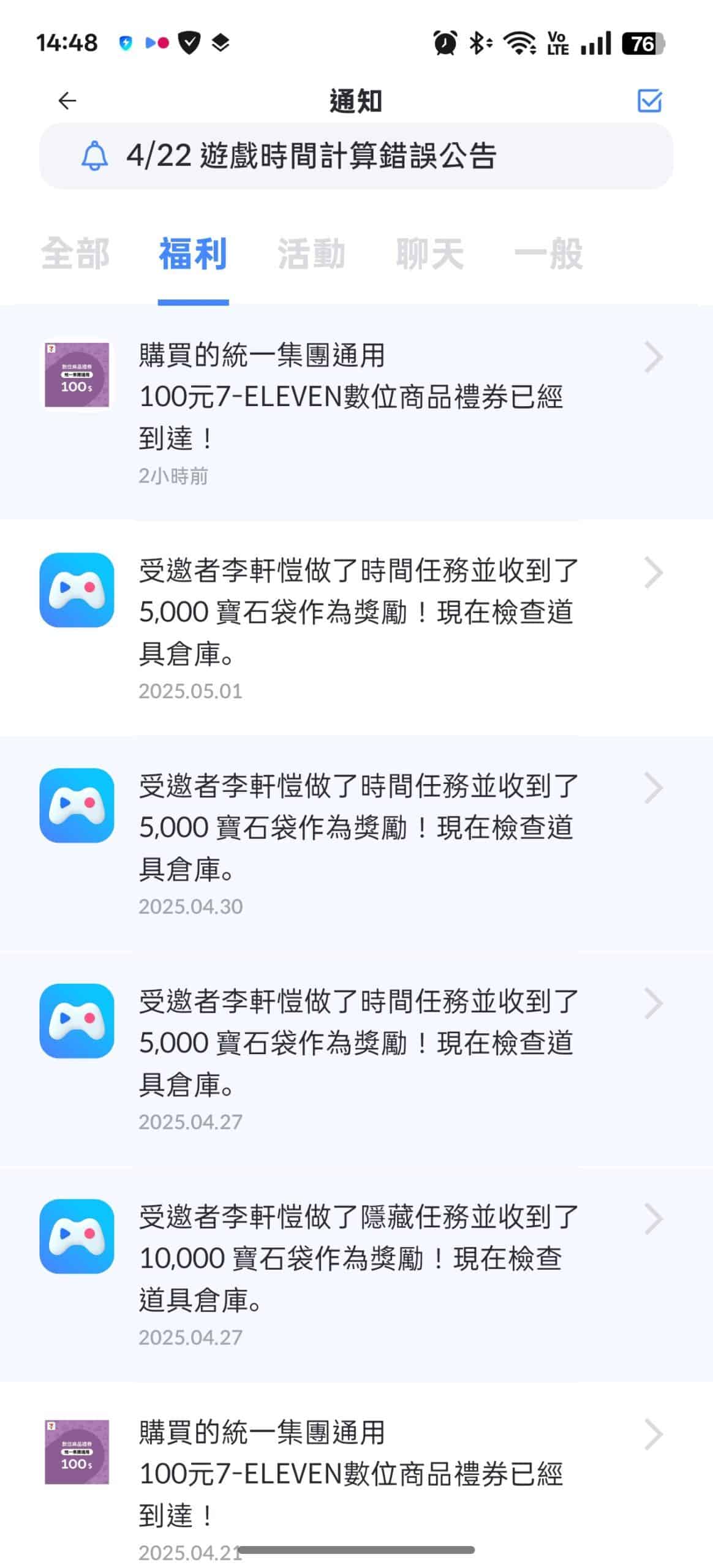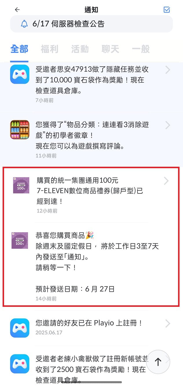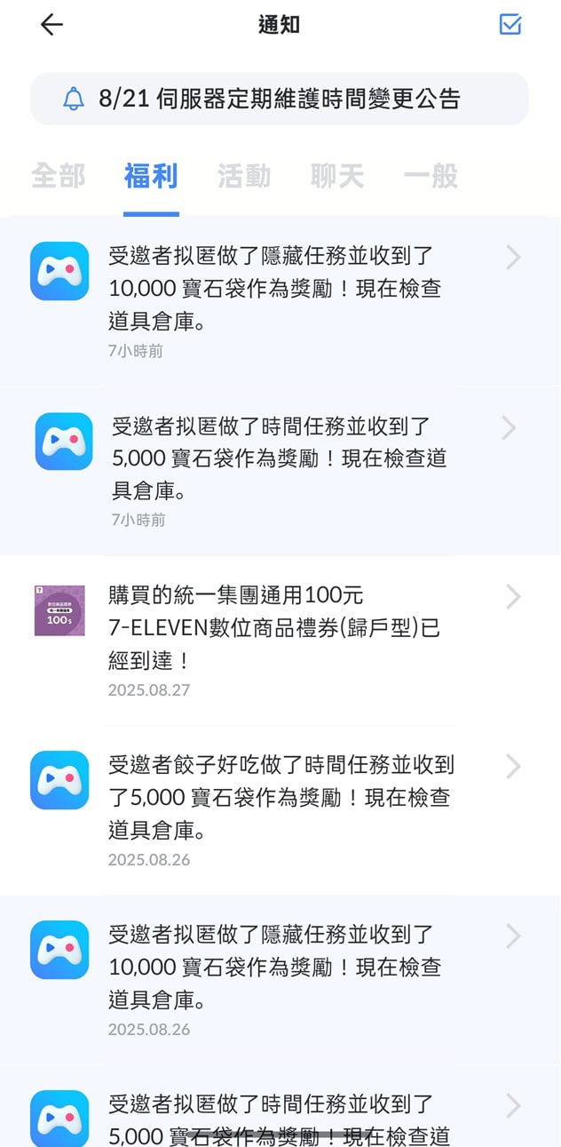 | 2025/08/27 | 7-11 禮券 NT$100 (歸戶型 ) | 2,500 金幣 | 兌換紀錄 |