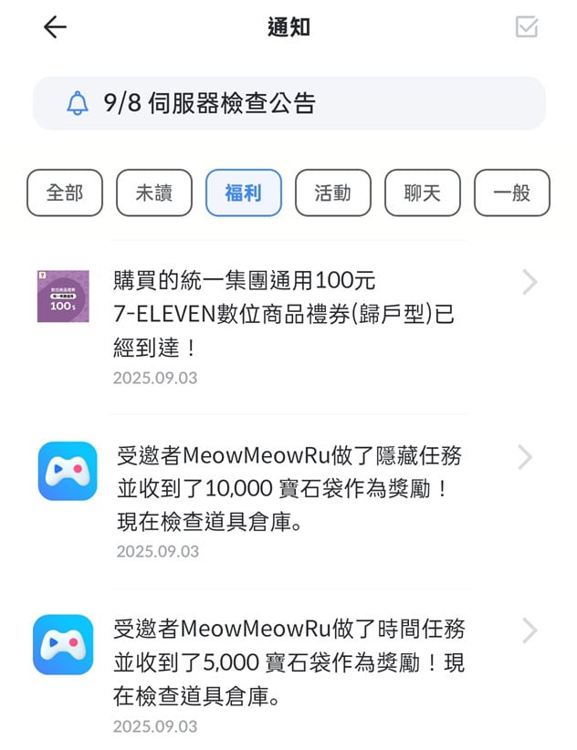 | 2025/09/03 | 7-11 禮券 NT$100 (歸戶型 ) | 2,500 金幣 | 兌換紀錄 |