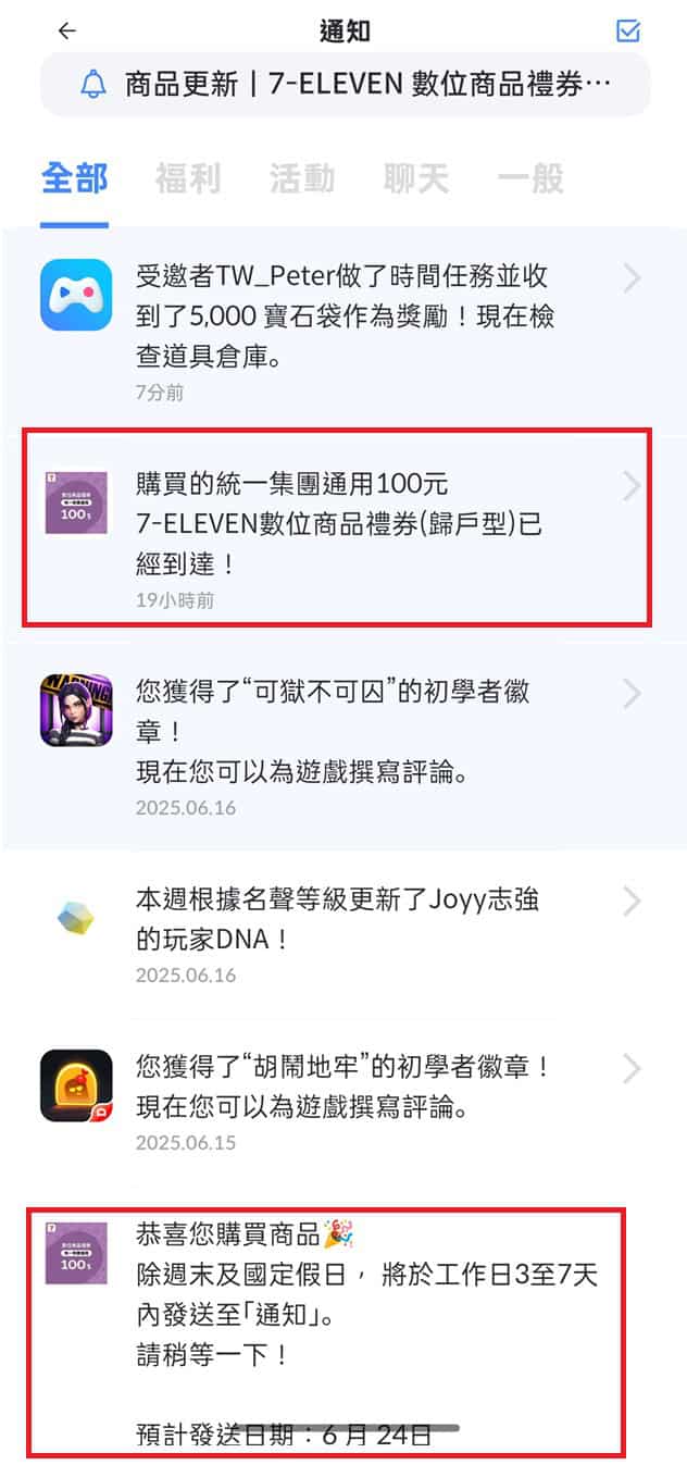 | 2025/06/21 | 7-11 禮券 NT$100 (歸戶型 ) | 2,500 金幣 | 兌換紀錄 |
