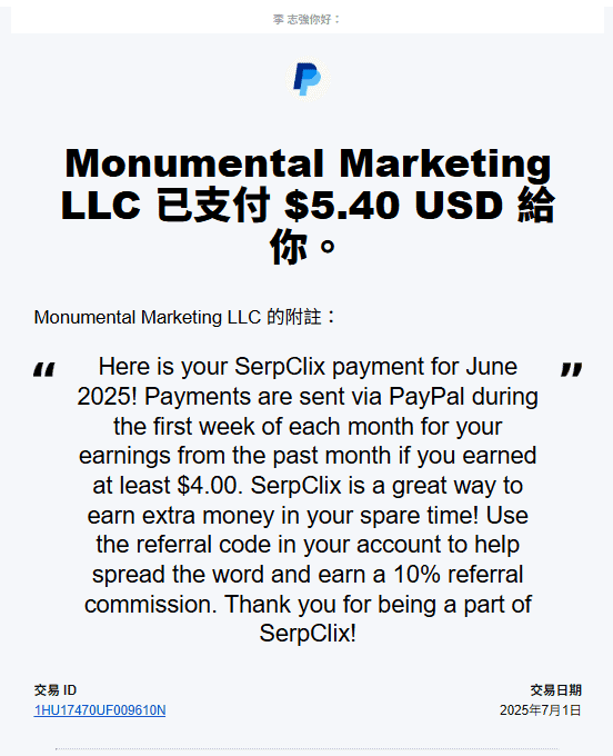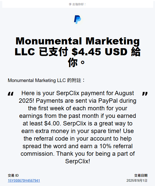 | 2025/05 | $4.23 | 2025/05/01 | Paypal | Paypal 截圖 SerpClix 明細 |